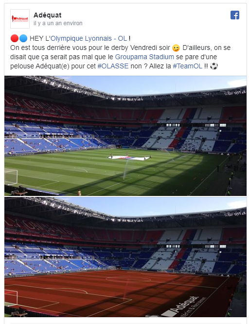 Rappelez-vous, Adéquat la marque qui se démarque avait fait le buzz avec son terrain rouge à l’occasion de la rencontre entre Saint Etienne et l’Olympique Lyonnais l’année dernière dans le cadre de sa première saison de partenariat avec le Club Lyonnais. Une communication relayée dans l’Equipe du 23/11/2018, Ecofoot, sport.fr, Goal.com, Sportune.fr etc…