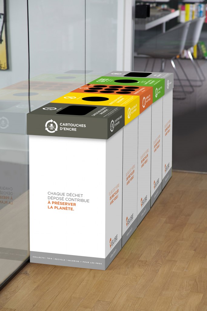 Le principe est simple : ELISE dépose différents conteneurs par type de déchets et permet de collecter 13 types de déchets différents comme les papiers de bureau, les gobelets, les cartouches d’encre, les déchets électriques et électroniques (DEEE), les canettes…