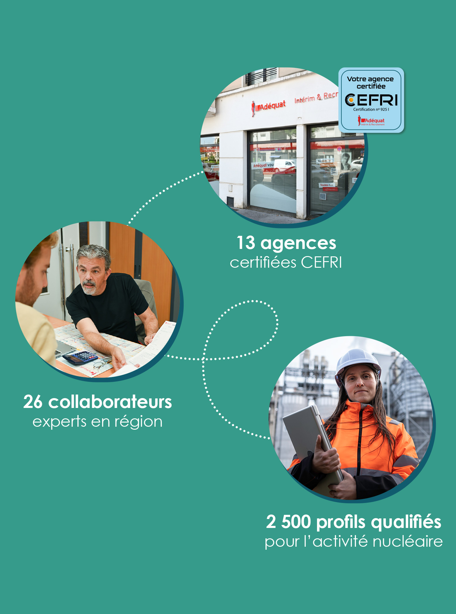 Dans ce contexte de croissance, Adéquat accompagne le secteur nucléaire via 13 agences spécialisées et certifiées CEFRI, proches des zones d’activité majeures.